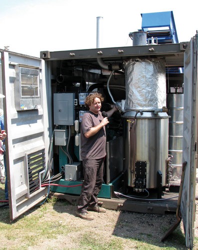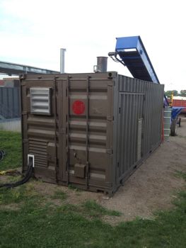 Todo o sistema funciona alojado em um único contêiner de 20 pés. O resultado é o PowerTainer, um sistema portátil que permite que um gerador a diesel opere usando mais de 90 por cento syngas ou gás de síntese vindo de pirólise de biomassa.